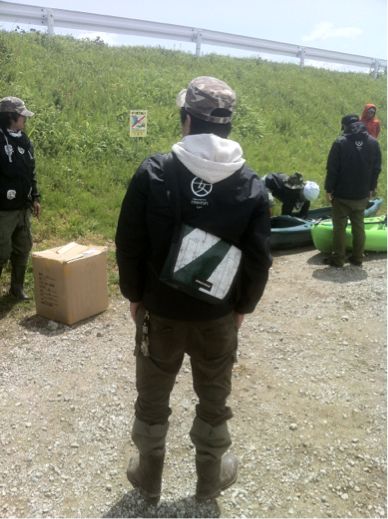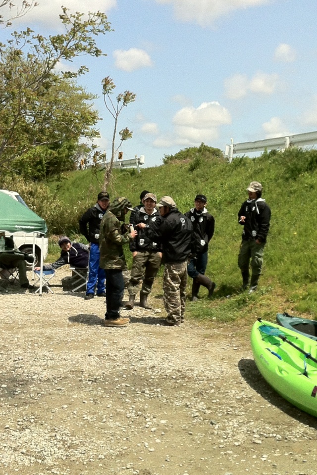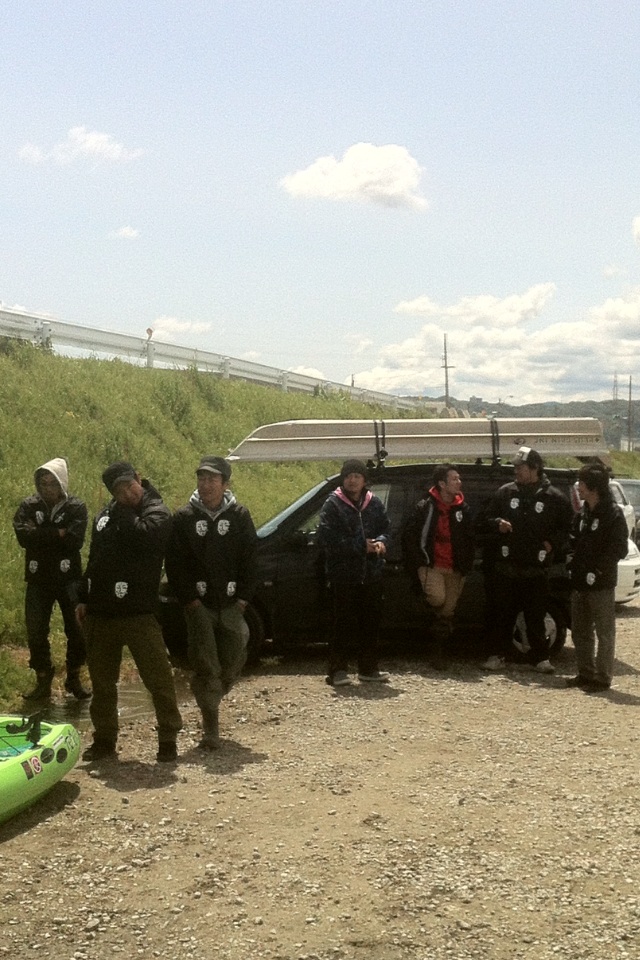 皆様にカメラを向けるとカヤックの隣で新手の仮面ライダーみたいにポーズをとりたたずむ後輩 ( ´▽`)